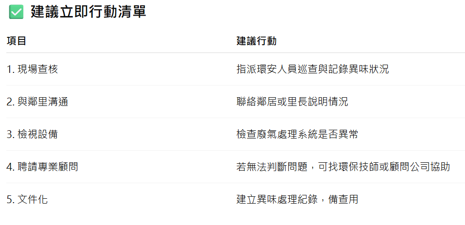 * 通常可能是排氣口、廢氣處理設備異常、原料儲存不當、污水處理設施等。